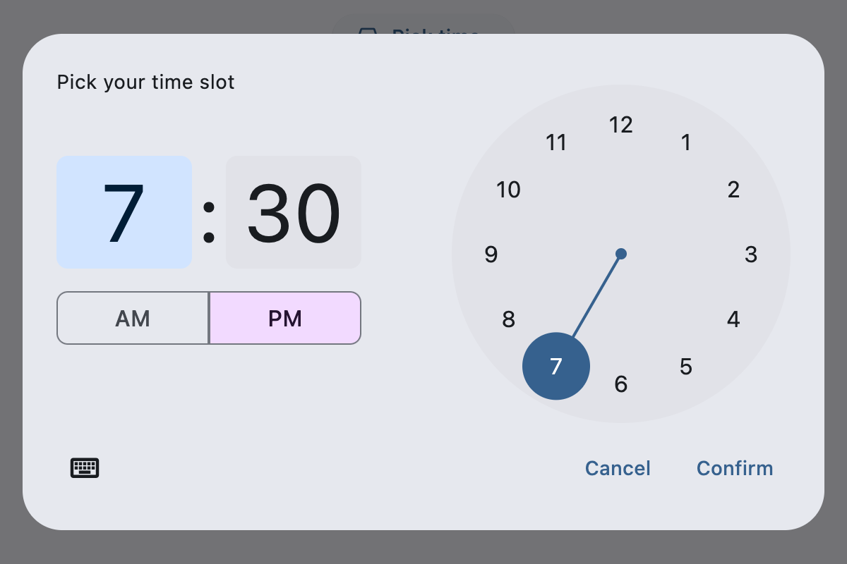 barrier_color- The color of the modal barrier that darkens everything below this picker's dialog.cancel_text- The text that is displayed on the cancel button.confirm_text- The text that is displayed on the confirm button.entry_mode- The initial mode of time entry method for this picker.error_invalid_text- The error message displayed below the input text field if the input is not a valid hour/minute.help_text- The text that is displayed at the top of the header.hour_format- Defines the hour format of this time picker.hour_label_text- The text that is displayed below the hour input text field.locale- The locale for this time picker dialog.minute_label_text- The text that is displayed below the minute input text field.modal- Whether this picker cannot be dismissed by clicking the area outside of it.orientation- The orientation of the dialog when displayed.switch_to_input_icon- The icon displayed in the corner of this picker's dialog whenentry_modeisTimePickerEntryMode.DIAL.switch_to_timer_icon- The icon displayed in the corner of this picker's dialog whenentry_modeisTimePickerEntryMode.INPUT.value- The selected time that this picker should display.